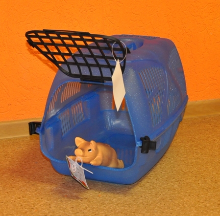 Легкая и практичная пластиковая переноска для кошек. Цвет голубой с черной решеткой. Размер контейнера 49х29х32 см.