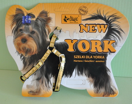 Шлейка New York -- специальная прогулочная шлейка для собак породы йоркширский терьер производства фирмы Dingo (Польша). Сделана из мягкой синтетической кожи, обратная сторона - стилоновая лента. Приятная на ощупь, деликатная шлейка в то же время прочная, экологичная и безопасная. Серебристая и золотистая расцветка. 2 кристальные лапки возле кольца крепления поводка.